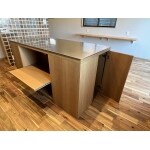 キッチンを敢えて壁向きにし、両側から行き来出来るようにアイランド型の家電収納カウンターを造作しました。 リビングとの間も2wayで移動出来るようにし、大きく間取りを変えなくても動線が良くなりました。