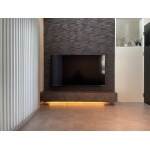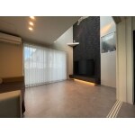 壁掛けTV、壁掛けTVボードに変更する工事をしました。併せて、リビングの吹き抜け部にはタイルを貼ってデザインし、スタイリッシュかつモダンな雰囲気のリビングに変わりました。 テレビボードの下には間接照明を入れたり、照明をダウンライトに変えたりしました。