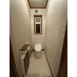 今回の貼り分けも植物柄ですが、優しい色合いの大胆な大柄のボタニカルスタイルの草花柄壁紙を縦に貼り分けたシックな印象に。 近くに洗面があるので、手洗いをあえて無くしてタンクレスにした事もあり、大胆な柄が映える空間に。