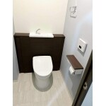 T社のレストパルI型を設置いたしました。 こちらはタンクありのトイレなのですが、タンクをキャビネットで覆うことで、あたかもタンクレスのようなスッキリとしたトイレを演出できます。 キャビネットカラーもブラウン系でカッコいいですね。