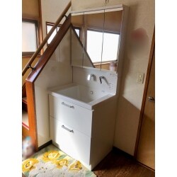 この度はご用命頂きまして誠にありがとうございました。洗面化粧台の混合水栓交換のご依頼でした。水栓交換も可能でしたが、収納が少なく、日用品の収納場所にお困りの様にお見受けしましたので、収納力のある引き出しタイプの洗面化粧台交換のご提案をさせて頂きました。鏡の裏にも収納がございますので、日常使う物も隠すことが出来て非常に便利です。また洗面化粧台天板の高さも、お客様にとって少し低い物をお使いになられていました。交換に際して、少し高い物をお選びいただきまして、腰をかがめる深さも浅くなりました。お客様に合った商品をご案内いたしますので、気になる点がございましたら、お気軽にお申し付けください。