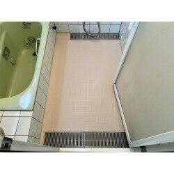 施工後の写真です。排水位置などは動いてないので、大きく解体などすることはなく、自然な仕上がりです。シートの厚み分、排水位置との段差が出来ますが、コーキング処理等を行い漏水の心配はございません。ユニットバスに交換するには高額だが、床をきれいにしたいというお客様にもおすすめになります。