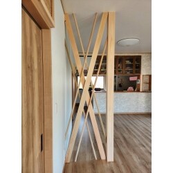 リビング~ダイニングの間仕切り壁を解体しましたが、どうしても外せない柱がありました。補強する必要もあり、筋交いを2本たすき掛けで取り付けました。構造材が丸見えの仕上がりになる為、丸棒で飾り付けをしてデザイン性を取り入れました。デザイン性を取り入れたことでお部屋と馴染んでいます。