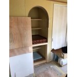 【工事内容】 床壁天解体復旧、サッシ内部壁塞ぎ2ヵ所、R下がり壁造作、巾木廻り縁施工、CF仕上げ、壁天井クロス仕上げ、カップボード取付