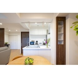 スタイリッシュなキッチンとナチュラルな床材が合うダイニング