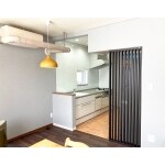 施工前のキッチンは家の奥の方にあり、暗く狭い印象のキッチンでした。今後のことを考えてキッチンを明るく広々としたスペースにすることを考えて工事をご提案致しました。まずは既存のL型のキッチンをI型のキッチンへ変更し、リビング側へ位置を少しだけ変更。キッチンの対面には食器棚を新しく設置し、可動棚も新設したことで収納が多く広々とした空間になりました。また、照明機器もダウンライトに変更しスタイリッシュで明るい空間へ。リビング側には木目調の格子を取り付けたことで、急な来客時には視界の制限をしたり、素敵なアクセントになりました。