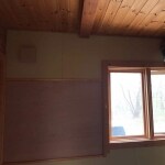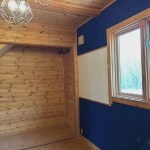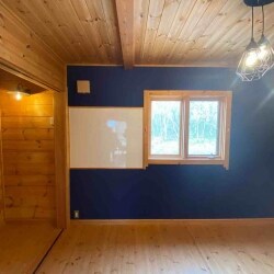 木目を生かした内装でしたが、施主様のご要望があり、青を基調としたクロスに変えたい。 また、一部分を黒板のようにして子供たちがお絵描きできるスペースにしたいとのこと。