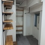玄関側の壁を撤去し、玄関土間と高さを揃えて、フラットにしました。天井を撤去し、高さを出しました。 棚はWOODONEの無垢板で可動棚にして、機能性と見た目を重視しました。