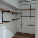洋室の半分をWICにしました。床を土間より一段上げました(廊下と同じ高さにしました)。 可動棚はWOODONEの無垢板です。 ハンガーポールも可動にしています。