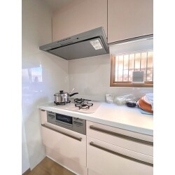 I型キッチンへの変更に伴って後ろにあった壁を撤去。より開放的で明るい雰囲気になりました。キッチンに合わせた桜色のカップボードで収納力もバッチリです!