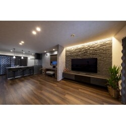 和室をなくしてLDKにし、家族5人がくつろげる大きなソファを置きたい。 壁掛けテレビや間接照明に憧れがあり、カッコいい雰囲気のお部屋にしたい、とのご要望でした。