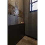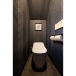 内装をダークトーンでまとめ、アクセントでモザイクタイルを施工しました。トイレットペーパーや掃除道具が仕舞える奥行150の収納を造作したことにより、すっきりとした空間になりました。