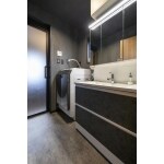洗面台と洗濯機の間に少しスペースがあったので、収納力アップも兼ねて750サイズから900サイズにすることを提案しました。浴室・トイレと内装を合わせて、ダークトーンの扉を選定し、まとまった空間を作り上げました。