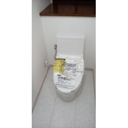 トイレの水漏れはウォシュレットの経年劣化と、便器のパッキンが薄くなっているために発生していたものでした。 ウォシュレット一体型のトイレに交換しました。 汚れがつきにくく落ちやすい加工と、凹凸がないノズル回りでお掃除が楽にできる商品をご提案させていただきました。 床は、トリプルガードハード塗装により、水の浸入による表面の変色がほとんどなく、一般細菌の増殖やアレル物質を抑制し、 床材表面を衛生的に保つことができるフロアをご提案させていただきました。 クロスの張り替え、紙巻器の交換、木幅木と床見切りも交換し、明るく落ち着く空間になりました。