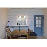 独立型キッチンのドアだった部分を壁にし、開口部を設けダイニングとキッチンのコミュニケーションがとりやすくなりました。ブルーグレーオークのドアが空間のアクセントに。