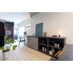 多角形の壁をメリットとして感じて頂けるように、天井形状は多角形の壁に平行になるように斜めでご提案。それだけでもモダンな空間になります。エアコンは天井埋込をご提案し、壁面をスッキリとさせました。 お仏壇を置く収納カウンター、家電収納は造作家具でご提案し、ツートーンにする事によりスタイリッシュさが増します。寸法もしっかりと打合せしました。 TVは壁掛にされるとの事だったので、後の収納を利用しDVDスペースとしてのニッチをご提案。 キッチン側の多角形は変形カウンターをご提案。炭酸水メーカーや圧力窯などの家電をお持ちだったので、使いやすい位置でご提案しました。 イメージは明るい床がお好みだとの事で、そこから全てのコーディネートはお任せ頂き、素敵なスタイリッシュモダンなLDKが完成しました。 ハード面では、しっかりと区画断熱をして、内窓、断熱性の高い窓を入れました。