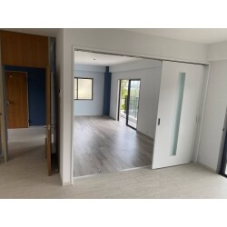 LDKの壁を取り洋室と繋げました。 部屋を分けられる様に間仕切りとして3枚引違い戸を設置しました。 洋間とLDKに段差がありましたが、スロープを自社にて製材しています。