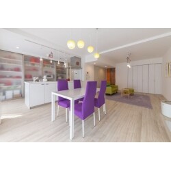 ビビットなカラーのダイニングチェアや個性的なペンダントライトが映えるダイニング。
