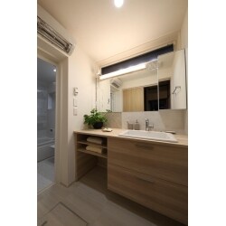 広い洗面脱衣所に、大容量の収納棚を設置いたしました