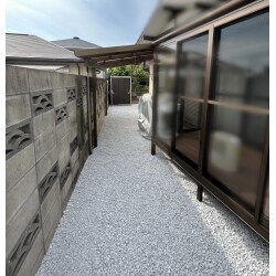 当初、お客様からはコンクリートにしたいとのご要望を頂きましたが、ご予算との兼ね合いもありましたので、防草シートに白バラスという別パターンもご提案させていただきました。 裏に続く通路ということもあり、バラスにすると足音が聞こえるので防犯対策にもなります。