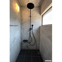 水栓、タオルバー、照明ともお施主様こだわりの商材でモダンな空間に。 天井と壁は防水モルタル仕上げで床はINAXのサーモタイルをご選択されました。 防水面や給排水面で丁寧な施工を施し、デザイン性だけでなく機能面も向上いたしました。