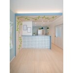 レーザーでシナ合板をくり抜き壁から天井に掛けてデザイン。