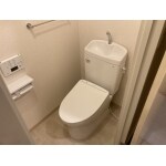 新しいトイレは掃除しやすい節水型になります。 紙巻器は2連のタイプに変更して、しっかり壁下地の補強をしましたので、多少手をついてもビクともしません! タオル掛けもシンプルなデザインのものに交換しました。 ベージュ系の色味統一されてスッキリした内装になりました。