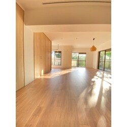 和室の床・壁・天井・押し入れを取り壊し、一間続きの大きなリビングの完成です。新たに施した床は、3部屋高さを調整し、防音フローリングにしました。 収納は左側の壁一面を大きなクローゼットにしています。窓の外の借景の緑が鮮やかです。