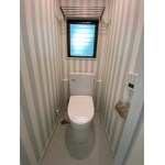 配管隠しの段差が出来ましたが、クロスのストライプといい感じに調和しました。床とクロスは、奥様がしっかり選ばれた柄です。クロスはサンゲツSP2889、CFは、リリカラ81371です。明るいトイレになりました。