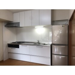 収納を充実させたいとのことでしたので、吊り戸も同じように設置致しました。前回は開き扉でしたので、かがんで容器の取出しを行っておりましたが、今度はスライドタイプなので、かがまず、奥まで使い切ることが出来ます。明るめの色味とのことで、白一色で統一させて頂きました。キッチンライトもLEDとなり、より明るくなりました。