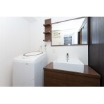 素焼きタイル風のお洒落なクッションフロアが印象的な洗面脱衣所