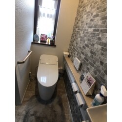 天井・壁・床のクロスは、それぞれ違う物を使用し、素敵な空間となりました。 トイレ本体は、タンクレスでスッキリとしました。 また、手洗いは、給排水工事が不要の物を取り付けました。 これからトイレ工事をされるお客様にとてもおすすめです。