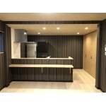 納得のいくデザインになるまで、何度も打合せをし、様々な色や素材のパターンをご提示いたしました。 キッチンは対面式なので料理をしながらリビングの様子をご覧いただけます。 また照明のダウンライトがより落ち着いた空間を演出しています。