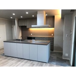 天井と壁・建具は、キッチンに合わせて統一感のあるグレー系にまとめ、床材は木目の濃淡がランダムなタイプを採用しました。内装と照明器具がお部屋を洗練された印象にまとめています。