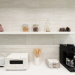 間仕切りを撤去した場合、リビング側から冷蔵庫が見えると圧迫感があるため、奥のスペースを新しい冷蔵庫置き場とし、目立たないようにしました。 また、キッチン奥のクロスをリビングと揃えることで、空間に一体感を持たせています。