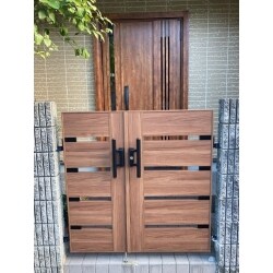 門柱を新たに建てると扉が小さくなってしまうので、既存の吊元金具を再利用して扉の大きさを変えず。なおかつ玄関ドアと同じウッディ調に仕上げさせていただきました。