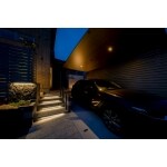 車が停められる様に敷地の右側部分を車庫スペースにして、アプローチを真ん中に持ってくる計画にしました。カーポートはLIXILのカーポートSCを採用。プライバシー対策にSCの横板のサイドスクリーンを取付け、天井には2カ所ダウンライトを設置。大切なお車を上からカッコよく照らしてくれます。アプローチの階段にはマレアストーンという御影のような模様が特徴の天然石を使用し重厚感のある空間に。袖壁には凹凸のある天然石タイルを使用。お庭側から見ると花壇になっており、笠木部分はちょっと腰かけるベンチ代わりにもなります。お庭部分がプライベートな空間になるように、人工木フェンスで道路からの目隠しをしました。柔らかな色味でプランターや雑貨を飾れる棚もあり、リビングからみても癒しの空間になること間違いなしです。カースペース、アプローチ、お庭からの見た目が格段にかっこよくなり、ライティングで夜の雰囲気も存分に楽しめる空間になりました。