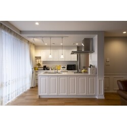 キッチンの向きを変えて対面型キッチンを設置しました。 エレガントなフレンチモダンをテーマに、奥様たってのご希望でキッチンに框扉の採用と腰壁にモールディングを施工。 扉や取っ手など細部に至るまでセミオーダーで選定できるハンセムのキッチンを採用しました。カウンターにはクォーツストーンを。重厚感のある素材ですが、白を採用することで明るく軽やかな印象になりました。