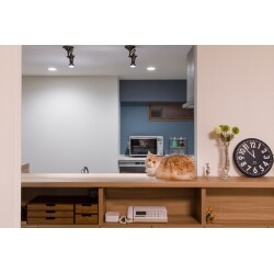 キッチンのカウンターは猫ちゃんもお気に入りで、毎日そこでくつろいでいるそう。 キッチン移動の際、取り込んだ納戸に収納してあった荷物をスッキリと片づけられるよう、収納効率の高い可動棚付の壁面大型収納を設置。 また洗面所の梁下スペースへ小さな空間も有効に利用出来る薄型収納や、ダイニング側に収納スペースの付いたキッチンカウンターなど多彩な収納プランを提案した。 玄関とキッチンの間の壁に室内窓を設け、立玄関~LDKへの風の抜け道を作った。