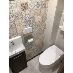 トイレ本体の色褪せとイメージも一新したっかったこともあり、リフォームをご依頼頂きました。 トイレの給水栓を気にされていたこともあり、給水栓を隠せるタンクレスタイプのトイレ「ネオレストDH1」を提案しました。給水栓を隠すことで、すっきりとした印象のトイレになりました。 トイレ本体に手洗い器がつかなくなるため、新しく設置しました。職人と現地調査をしたうえで取付位置を確認し、施主様ご希望の位置に取付けができたためお喜び頂けました。 内装は、ご自宅全体がナチュラルテイストでゴールドの家具を置かれていたこともあり、家になじむようなカラーを選定しました。アクセントクロスには、アジアンテイストな仕様で遊び心をプラス。床は清掃面も考慮し、石目調のフロアタイルを選びました。