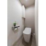 トイレはパナソニックの「アラウーノ」へリフォーム。タンクレストイレになりお掃除が格段にラクになりました。天井からトイレの背面にかけて、グレージュのアクセントクロスをつながるように貼り、奥行きを感じる落ち着いたトイレ空間となりました。