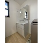 既存同様に、三面鏡に壁だし水栓のタイプですが、立上り部分とボウル部分が一体型のスクエアタイプの洗面はスッキリとした仕上がりで、収納もたっぷりです。