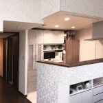 開口を広げ、とてもすっきりした印象に変わりました。大き目食洗器と大容量のトールキャビネットで溢れだしていた調理器具などの物が収まり、更にすっきりしたキッチンに。お色のクレー系に合わせ、お部屋全体を繋ぐ壁紙の柄をおしゃれにコーディネイトされました。