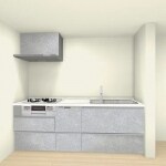 ⼈⼯⼤理⽯カウンターで食洗器付きシステムキッチンと掃除のしやすいレンジフードをご希望でした。流し台上の吊り戸は取っても良いかもと感じておられ、インターホンの位置が気に入らないとのことでした。