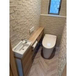 タンクレスでコンパクトなサティスSリトイレにすることで、空間がすっきりとしました。別付けの手洗い器キャパシアは、収納面も充実し、長いカウンターも便利です。居心地の良いトイレ空間となりました。