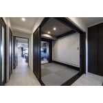 和室と一体感を出し縁側をイメージした奥行きのある玄関土間をご提案しました。仕切りのL字引戸を開けると玄関~ホール~和室へと繋がり、窓からの採光でより開放感のある印象に。 「和モダン」のテイストにするため、建具は落ち着いた色味のソフトウォールナット柄で統一しました。
