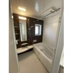LIXIL「リノビオ」のユニットバスに交換し、おしゃれな浴室が完成しました。 ダークカラーのアクセントパネルが高級感漂う雰囲気を出しています。