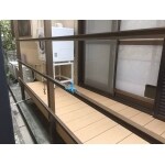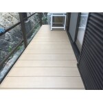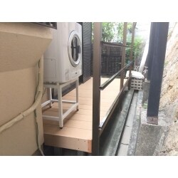 裏庭の屋根の下にウッドデッキを設置してガス乾燥機を設置しました。晴れの日には家の中から段差なく出てここに洗濯物を物干しに干せます。雨の日は強制的にガス乾燥機で乾かせて、家事ストレスの解消におおいに貢献できます。