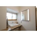 洗面台の上には鏡は置くことができないので横に鏡を置きました。また白色のクロスは使うことで空間を広く見せることができました。