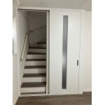 元から設置していたかのように全く違和感がありません。 規格品の商品では天井を低く造作する必要がありましたが、現状の高さを生かしオーダー品で設置しました。 スリガラスで反対側に人や物を認知できるので安心して開閉できます。 お部屋の光を階段へ取り込めるので、階段が暗くなることはありません。